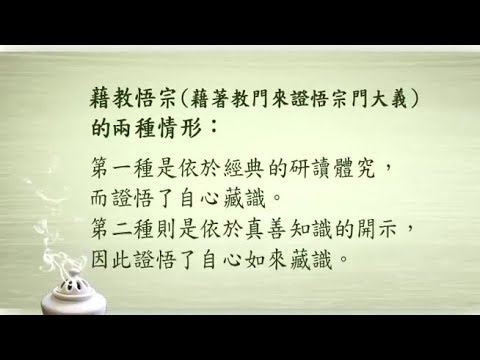 如果不是經由教外別傳的禪宗參究本心如來藏,而是依止一般大乘的法門而得到證悟,那就叫作藉教悟宗(藉著教門來證悟宗門大義)。這種方式有兩種情形:第一種是依於經典的研讀體究,而證悟了自心藏識;第二種則是依於真善知識的開示,因此證悟了自心如來藏識。