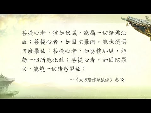 因此在《華嚴經》中,善財童子也為了我們向 彌勒菩薩請問:「這一個如來藏應如何住?菩薩云何學菩薩行、修菩薩道?」彌勒菩薩則回答說:【善男子!汝可入此毘盧遮那莊嚴藏大樓閣中周遍觀察,則能了知學菩薩行,學已成就無量功德。】(《大方廣佛華嚴經》卷78)那麼什麼是「毘盧遮那莊嚴藏大樓閣」呢?各位也已經想到了吧!是的,就是這個菩提心,這個本來自性清淨如來藏心,也就是前面所說的:「菩提心者,成就如是無量無邊,乃至不可說不可說殊勝功德。」